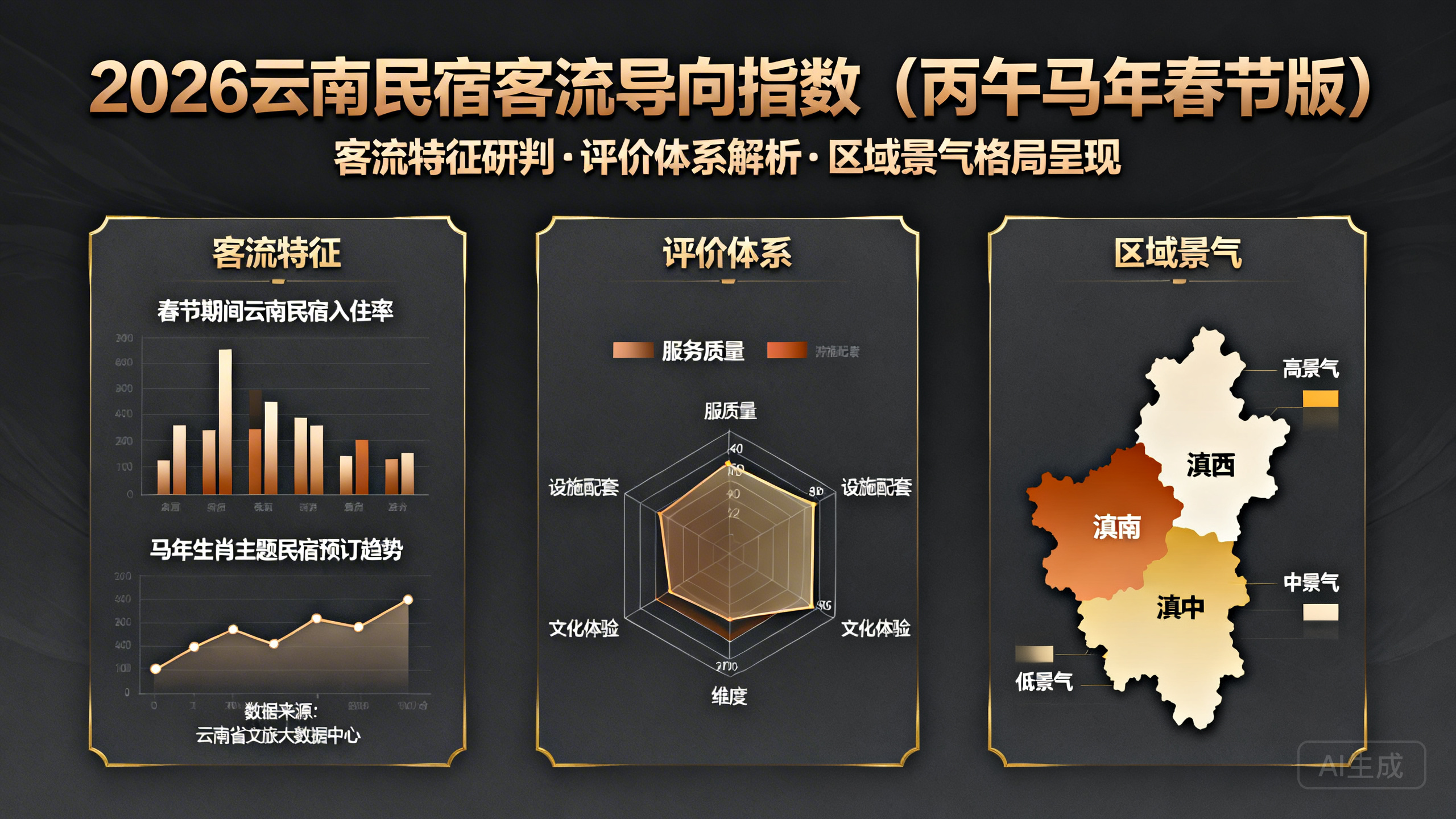 本报告紧扣《旅游民宿基本要求与等级划分》国家标准,结合云南民宿协会团体标准制定年度计划,按照40项团体标准和示范规则开展导向性研究。数据采样周期为2025年12月1日-2026年2月11日,覆盖全省16州市128个民宿集群,整合OTA预定指数、12306紧张指数两大核心数据维度,有效样本9.2万个,经AI智能监测+实地核查+动态校准,误差率<1.2%。